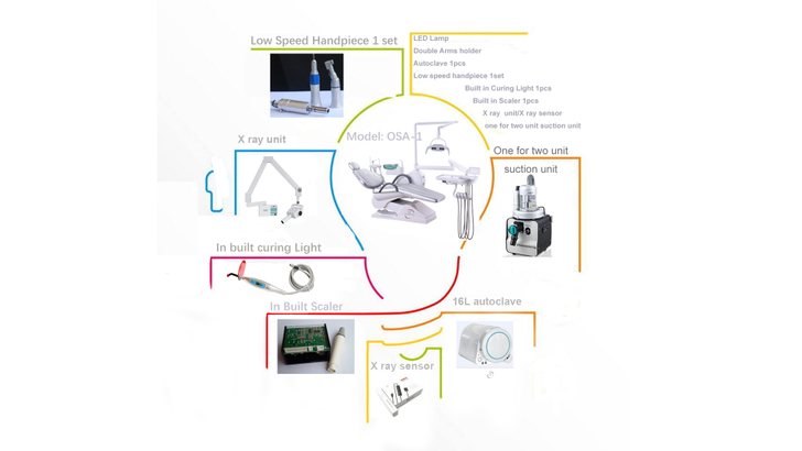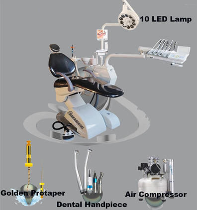 Pieza de mano de alta velocidad --- 2 piezas Pieza de mano de baja velocidad --- 1 juego Luz de curado de aluminio incorporada --- 1 piezas Escalador LED incorporado --- 1 juego Camello oral de 17 pulgadas con monitor --- 1 juego Compresor de aire de 550 vatios --- 1 piezas Destilador de agua --- 1 piezas Unidad de succión --- 1 piezas Gabinete --- 1 Unidades Lámpara Led --- 1 piezas Autoclave 23L con impresora --- 1 piezas .......