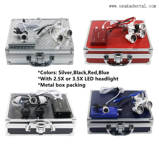 Lupas dentales económicas con faro LED y embalaje en caja metálica.