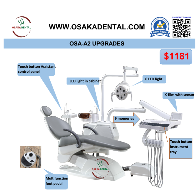 VENTAJAS Luz LED en el gabinete, más conveniente para verificar la máquina, otras fábricas no tienen Película X con sensor, otras fábricas no tienen 9 momeries 6 luces LED Botón táctil instrumento bandeja control systerm Panel de control auxiliar con portaherramientas de 4 ranuras Pedal multifuncional ESPECIFICACIONES Tubo de pieza de mano de alta velocidad con conector 2 agujeros / 4 agujeros 2 JUEGOS Tubo de pieza de mano de baja velocidad con conector 2 orificios / 4 orificios 1 SET Jeringa de 3 vías agua fría y caliente 1 SET Succión de agua 1 SET Eyector de saliva 1 SET Lámpara de operación 6 LED 1 SET X-film viewer 24V, con sensor 1 SET Posición ajustable con 9 momeries 1 SET Sistema de calefacción y agua purificada 1 SET Escupidor movible de vidrio / cerámica 1 SET Pedal mutilfunction 1 SET Cojín sanitario sin costuras YES Bandeja auxiliar con botón de control Tipo táctil SÍ Apoyabrazos DOBLE Taburete de dentista 1 SET