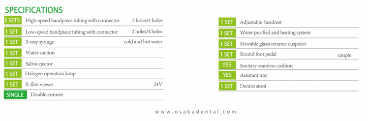 ESPECIFICACIÓN Tubo de pieza de mano de alta velocidad con conector 2 agujeros / 4 agujeros 2 JUEGOS Tubo de pieza de mano de baja velocidad con conector 2 orificios / 4 orificios 1 SET Jeringa de 3 vías fría y caliente 1 SET Succión de agua 1 SET Eyector de saliva 1 SET Lámpara de operación halógena 1 SET X-film viewer 24V 1 SET Reposacabezas ajustable 1 SET Sistema de calefacción y agua purificada 1 SET Escupidor movible de vidrio / cerámica 1 SET Pedal redondo simple 1 SET Cojín sanitario sin costuras YES Bandeja auxiliar SÍ Apoyabrazos doble SENCILLO Taburete de dentista 1 SET